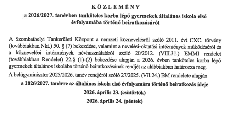 A Szombathelyi Tankerületi Központ, a nemzeti köznevelésről szóló 2011. évi CXC. törvény (továbbiakban Nkt.) 50. § (7) bekezdése, valamint a nevelési-oktatási intézmények működéséről és a köznevelési intézmények névhasználatáról szóló 20/2012. (VIII.31.) EMMI rendelet (továbbiakban Rendelet) 22.§ (1)-(2) bekezdése alapján a 2026. évben tanköteles korba lépő gyermekek általános iskolába történő beiratkozásának rendjét az alábbiakban határozza meg.